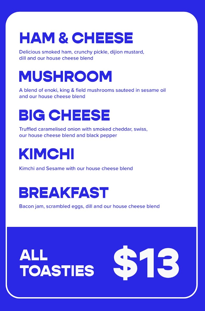Introducing the menu at Toastbuds, a cozy café nestled on Oxford Street, Bulimba, where toasties take center stage. Their simple yet thoughtful menu focuses on artisanal toasties, expertly crafted with house cheese blends that elevate classic and inventive flavors alike. Highlights include the Ham & Cheese featuring smoked ham, crunchy pickle, and Dijon mustard—that perfect balance of savory and tangy—and the Mushroom toastie, a rich umami blend of enoki, king, and field mushrooms sautéed in fragrant sesame oil. For those craving boldness, the Big Cheese combines truffled caramelized onions with smoked cheddar and Swiss, delivering decadent cheese pulls with every bite.